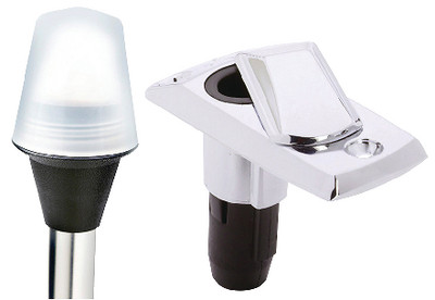 Stow-A-Way light with base provides 2-mile visibility for sail or powerboats under 39'. Anti-glare globe. 12V DC - 15 CP lamp included. Base is pre-drilled and countersunk to accommodate #10 screws. Base is die-cast zamak with Perma-Plate chrome finish. Overall height: 22". Poles are 3/4" anodized aluminum. Base fits Attwood 7100 and 5100 series.